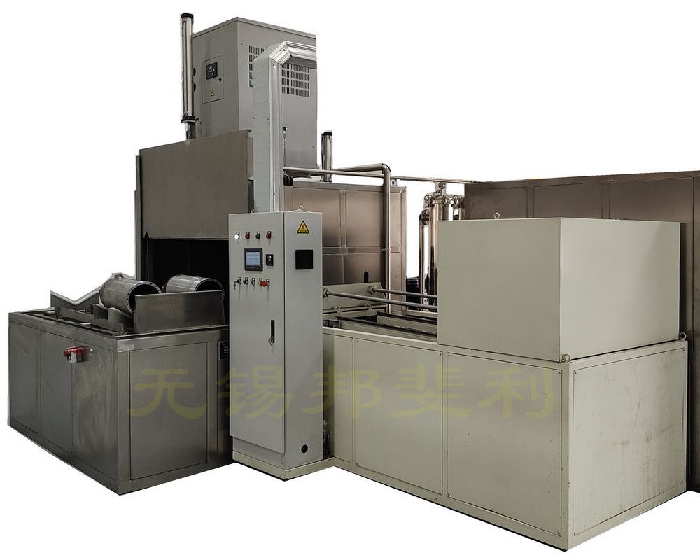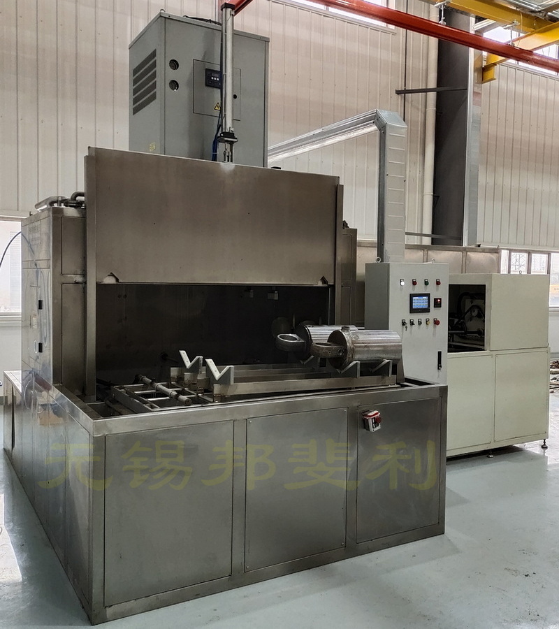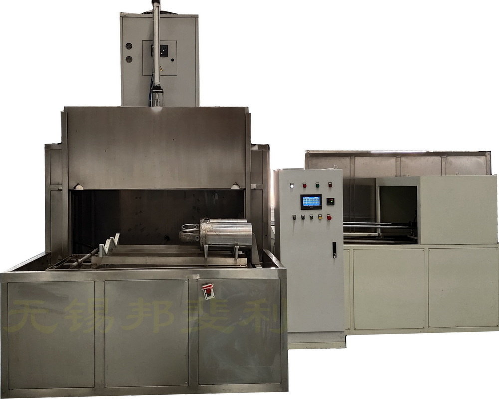 油气弹簧悬架液压缸体、活塞杆清洗机,本设备为组合式清洗机,用户根据实际使用需求,选择清洗油气弹簧悬架液压缸体、活塞杆的形式。工序布置为:人工上料→接油口清洗管→送进→关门→内腔刷洗、外表面冲洗、油口清洗→开门→退出→卸油口清洗管→人工下料。为使清洗液顺畅流出液压缸筒,液压缸筒与水平倾斜2º,通孔部位向下。由PLC作中心控制,除人工上下料、调整探针中心高度、调整刷洗深度外,其余均自动完成。